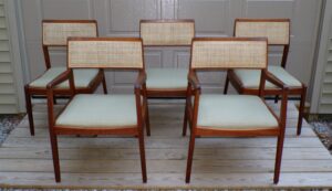 Vintage Mid Century Set of 5 Jens Risom Walnut and Caned Playboy Dining Chairs
