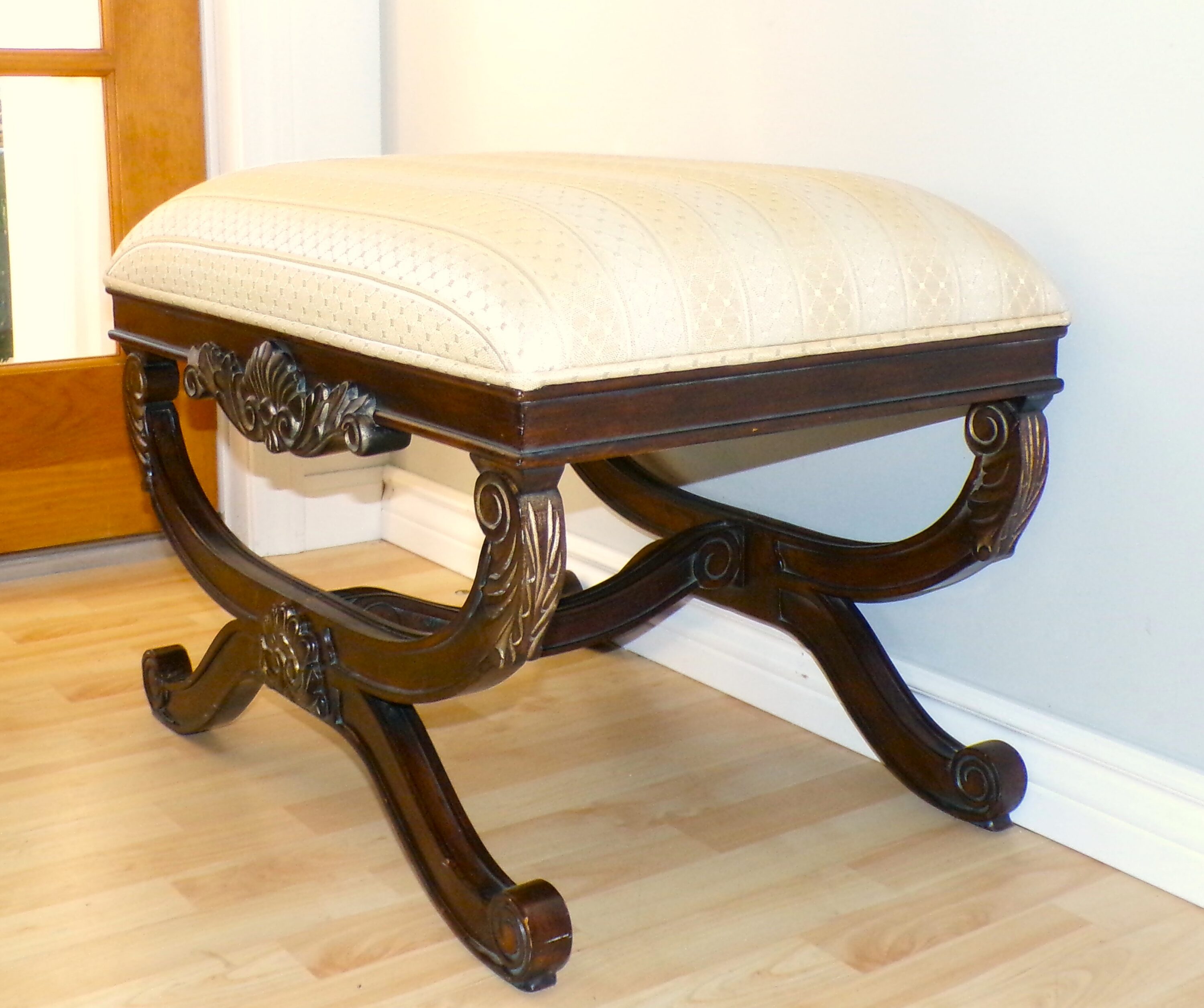 Casa Stradivari Neoclassical Style Curule Bench Ottoman Stool. Hollywood Regency Brocade Upholstered Stool Bedside Bench features a solid wood curved X base with carved leaf accents highlighted in a bronze finish and scrolled feet.