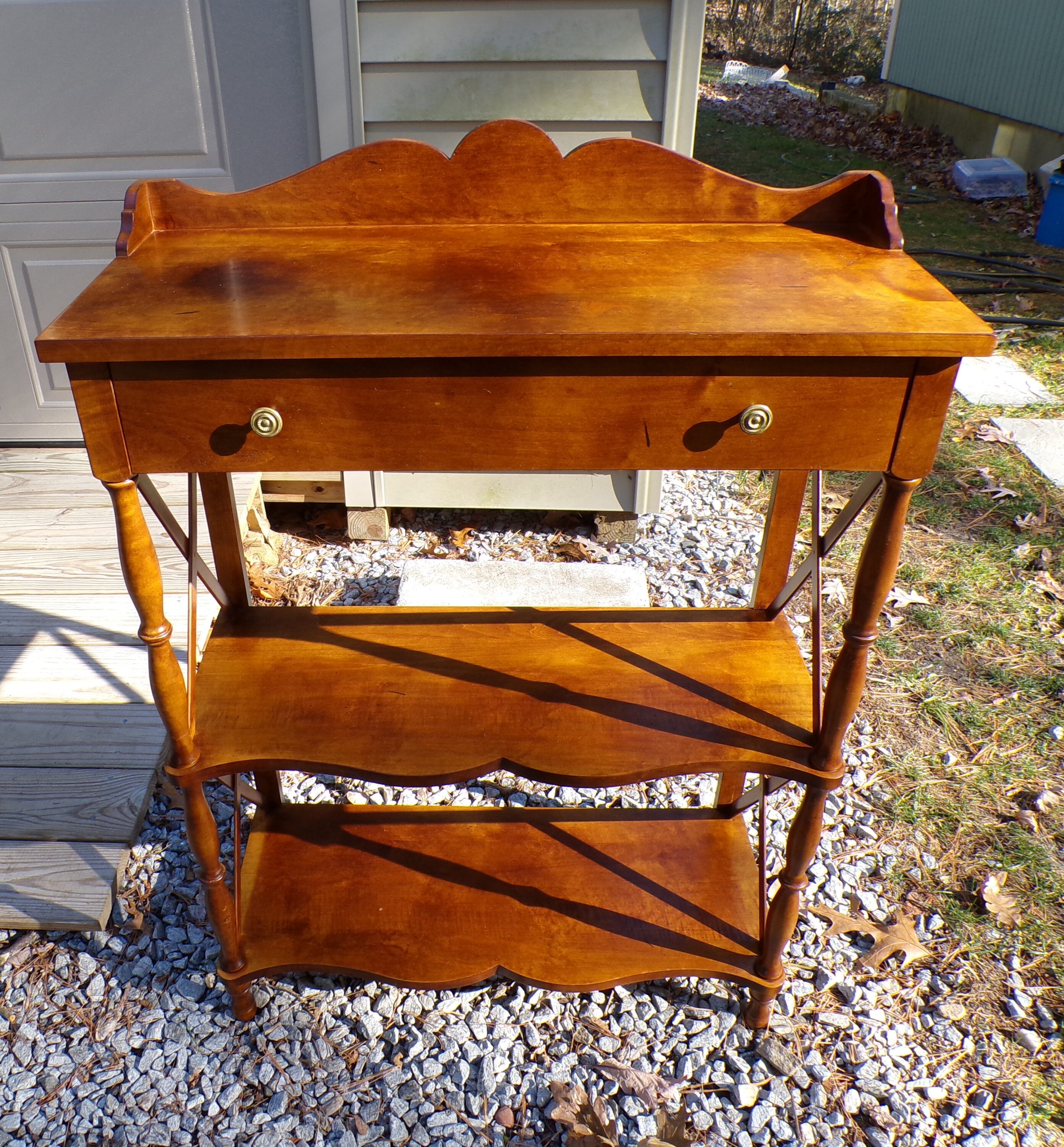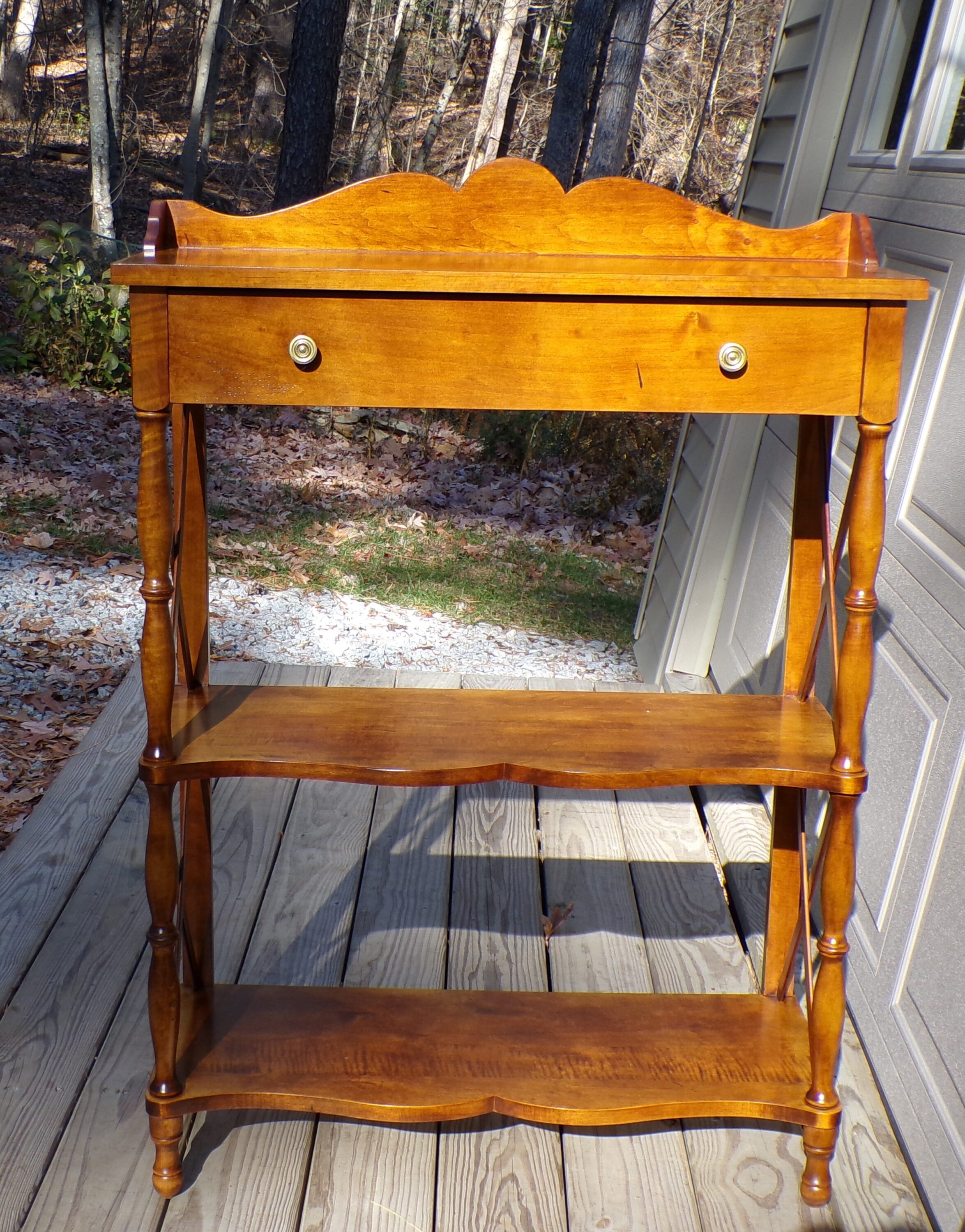 Vintage Madison Square Furniture etagere / shelf / bookcase part of their “Maple Collection”. It is made of solid Maple and features a traditional Early American style. Features an “X” cross-brace design on the sides, a sculptural backsplash and two lower shelves, spool-turned legs, and a single drawer with brass hardware.