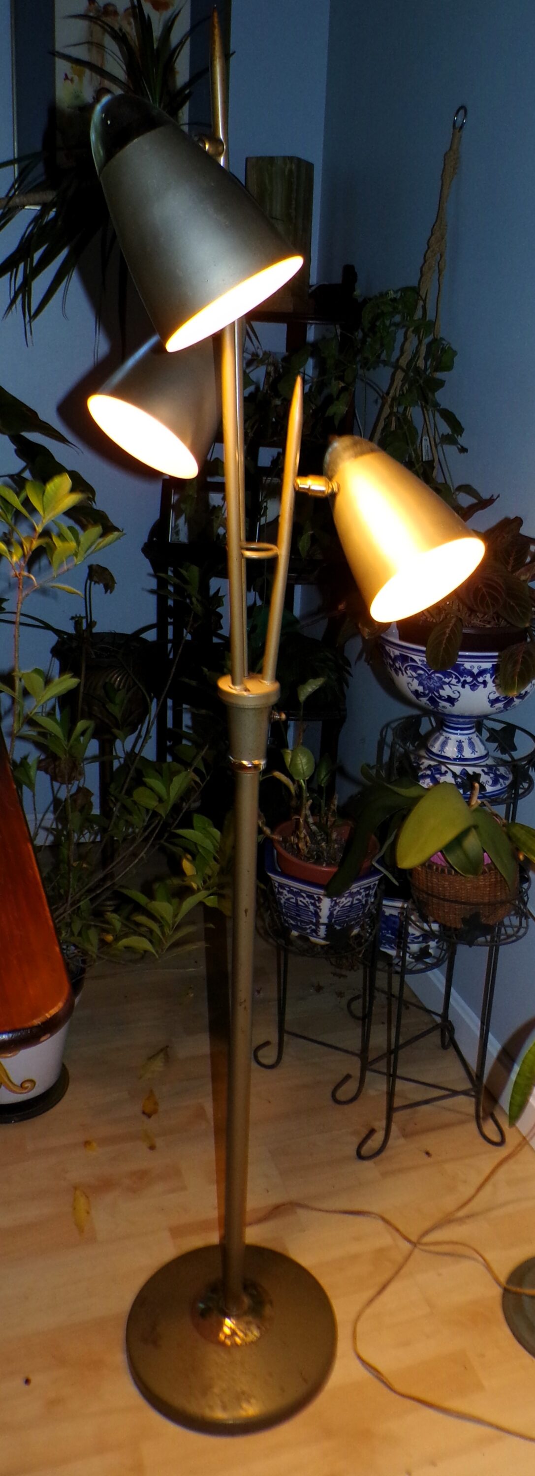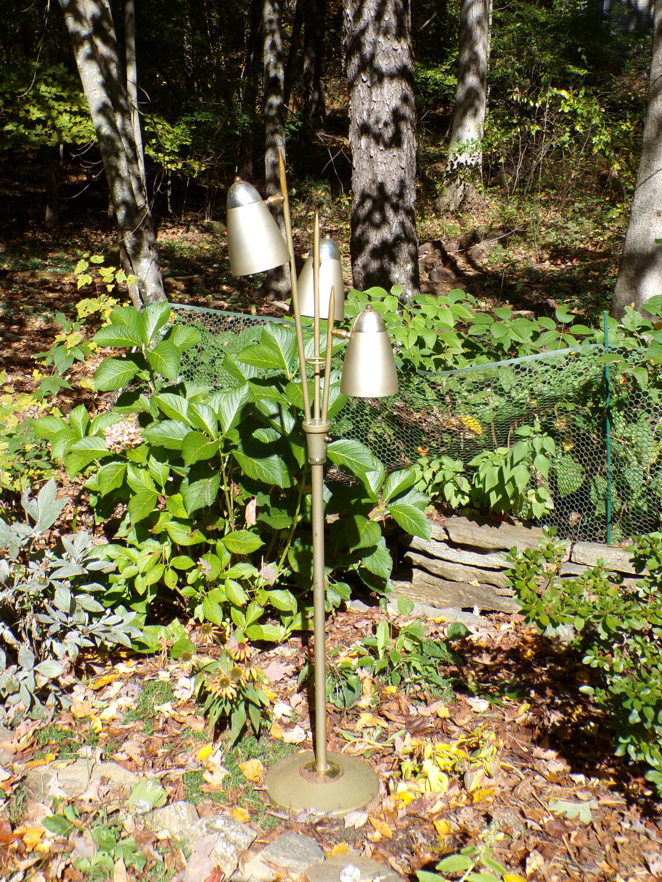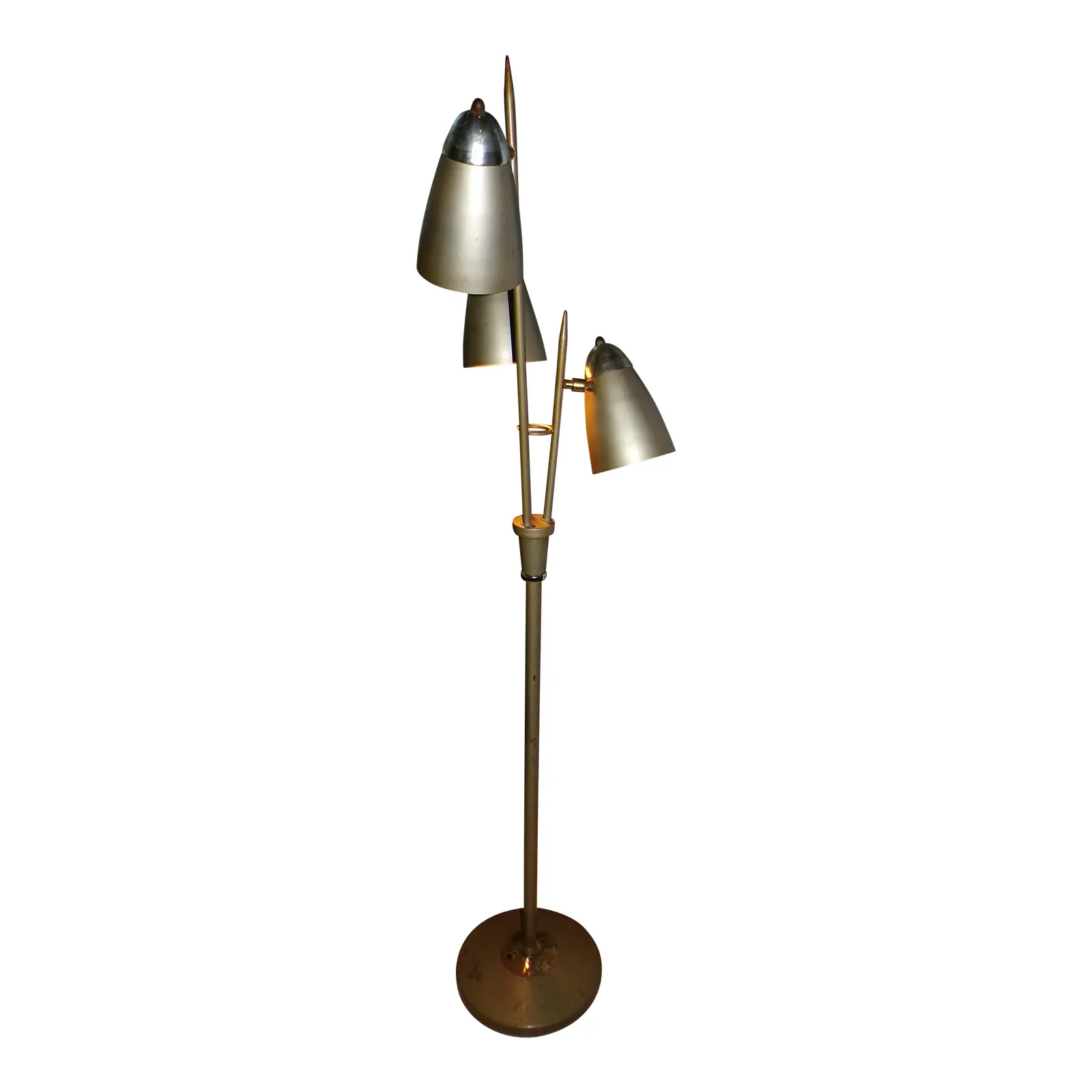 Vintage Mid Century Modern Industrial Avocado / Olive Color Cone Bullet Light Metal Floor Lamp . Features 3 moveable metal cone Bullet Shades that are on a various height tapered metal shafts, that meet in the middle with a ring. Light has 3 settings. In the style of Gerald Thurston Triennale Floor Lamp for Lightolier